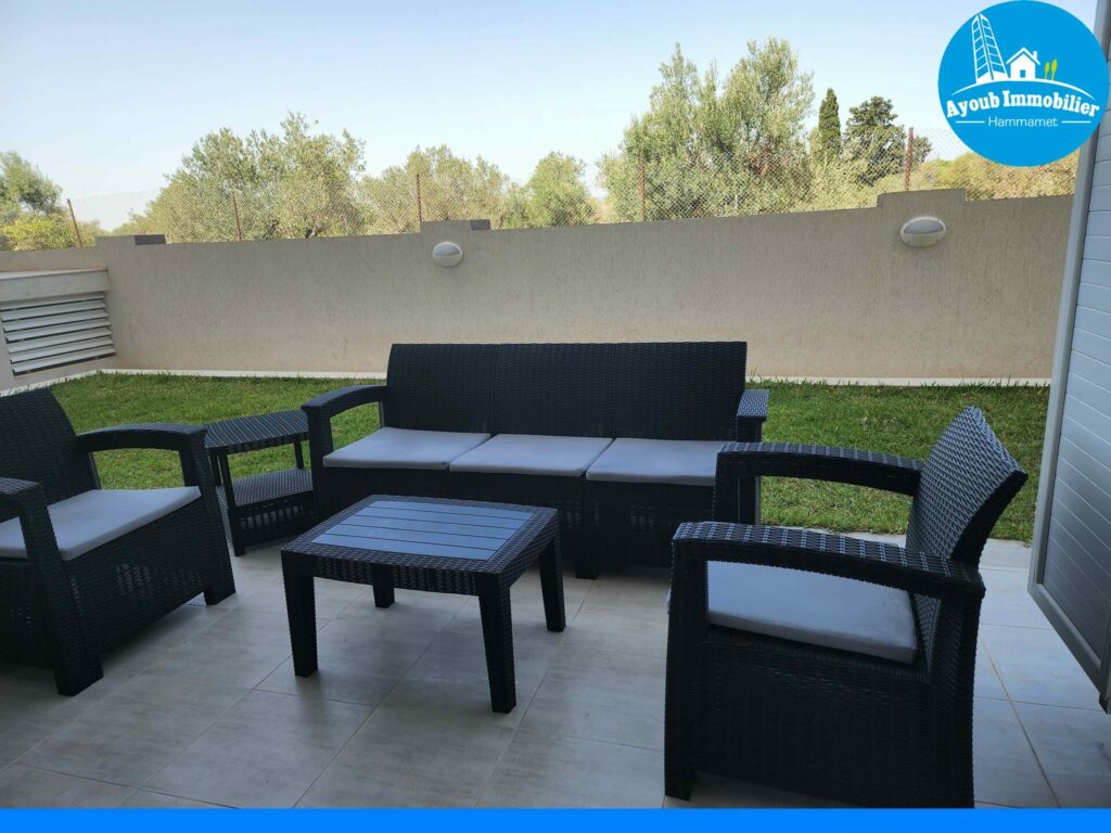En Exclusivité chez Ayoub immobilier : Bel appartement à quelques mètres de la plage à louer pour des courtes durées à Hammamet à la résidence Bousten, S+2 chauffées et climatisées, kitchenette équipée, salle de bain et un salon donnant sur un jardin privatif. L’appartement bénéficie aussi d’une place de parking au sous-sol et d’une piscine commune. L’ascenseur est aussi disponible. Prix 2.300dt la semaine.