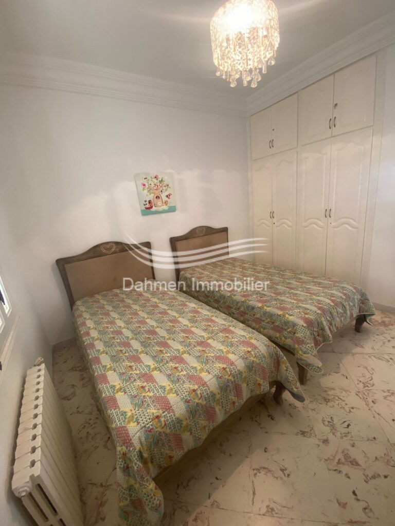 Dahmen Immobilier annonce pour une location annuelle ,un appartement meublé occupe le 1ère étage sans ascenseur d’une résidence sécurisée , située dans un quartier résidentiel calme à kantaoui. L’appartement est de : * Typologie : S+2 * Location : Annuelle / * Détails : Il est composé d’un salon , (02) deux chambres à coucher Une salle de bain , et une cuisine . * Equipements : – Chauffage centrale – Dressing- (02) deux terrasses