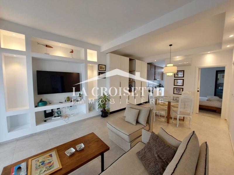 Cet appartement meublé S2 pieds dans l'eau à La Marsa est l'opportunité idéale pour ceux qui souhaitent vivre une expérience de vie unique, avec la mer à leurs pieds et tout le confort moderne à portée de main. N'hésitez pas à découvrir ce joyau immobilier qui combine élégance, confort et vue exceptionnelle. Référence : MAL1985.