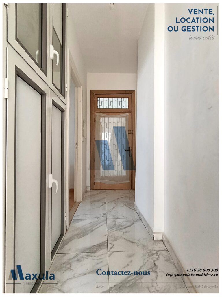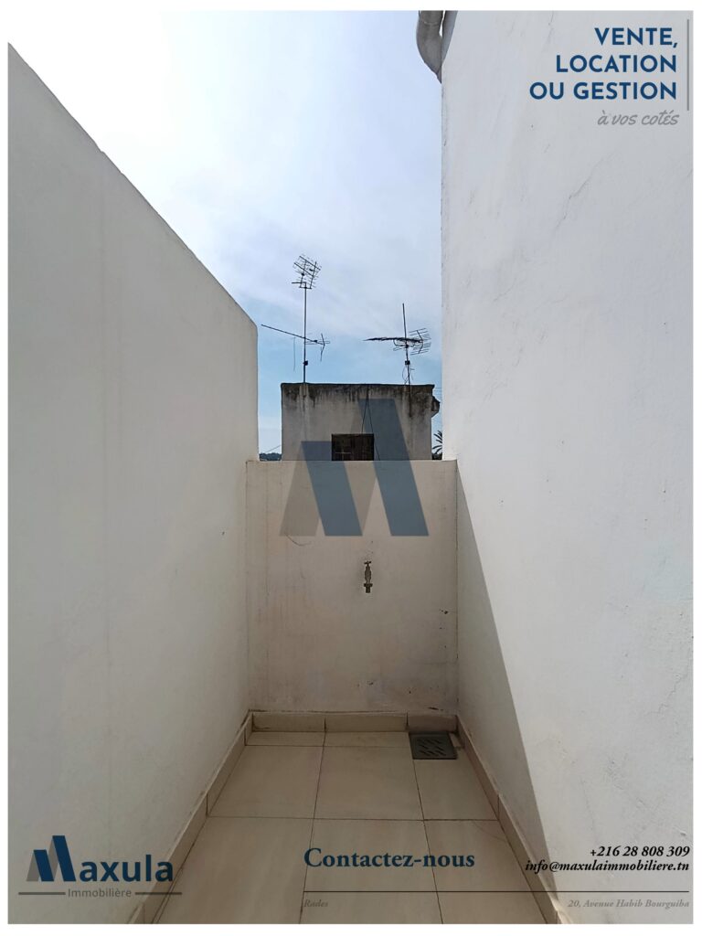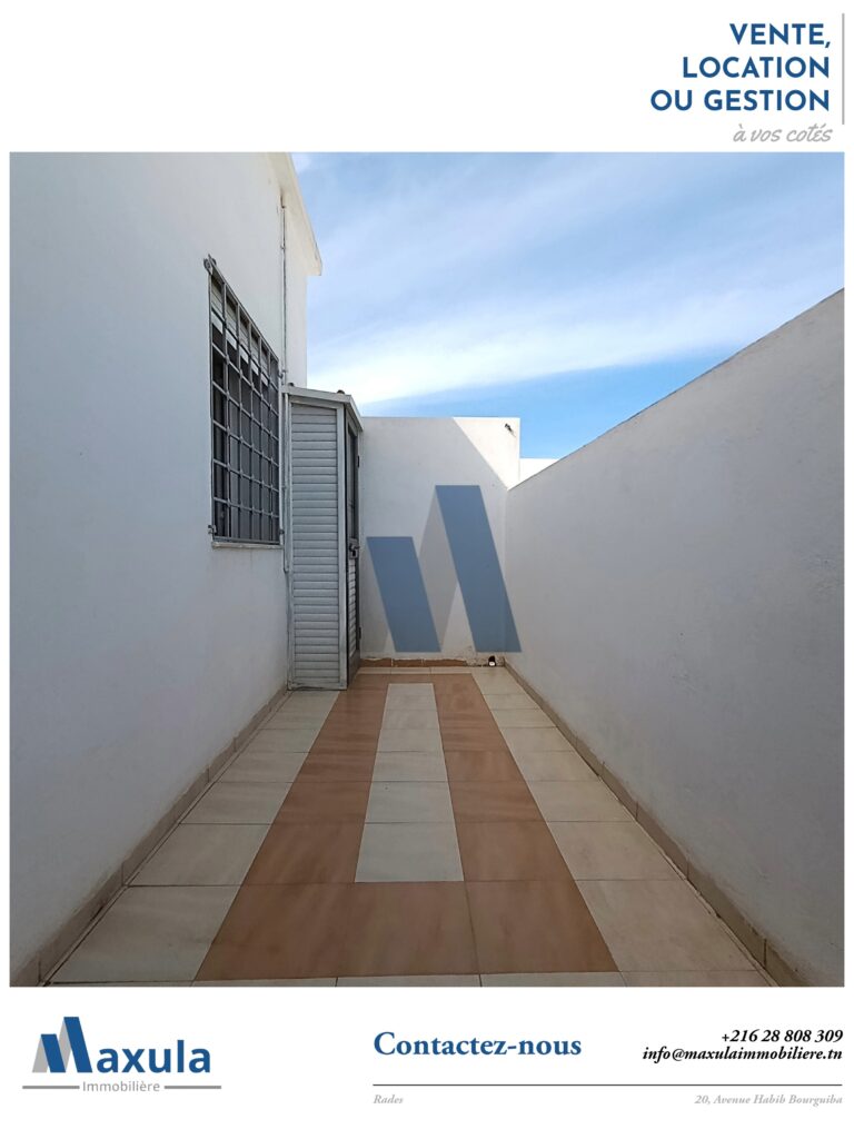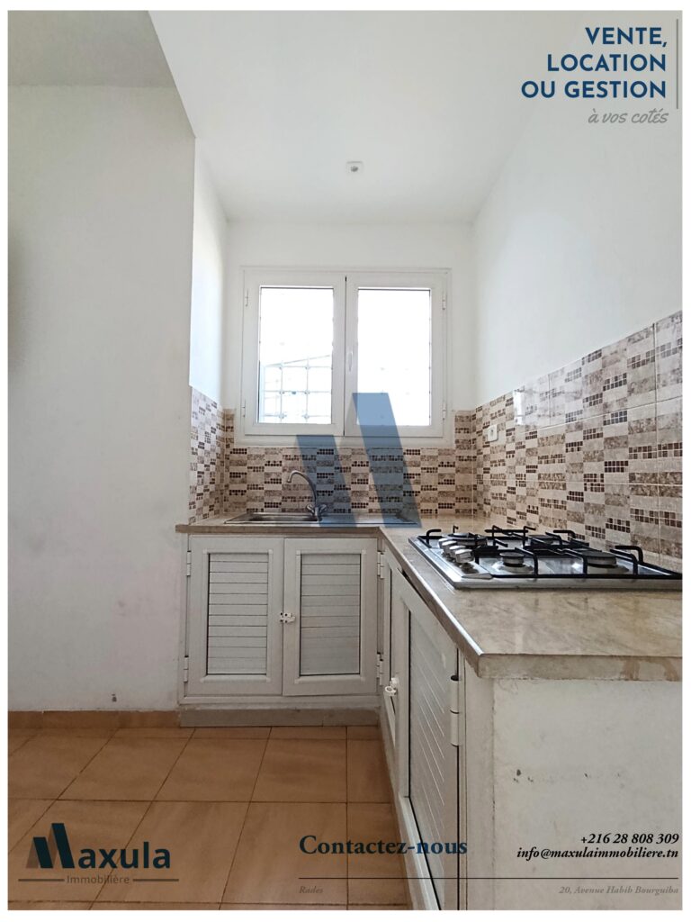 MAXULA IMMOBILIERE vous propose à la LOCATION un coquet APPARTEMENT S+1 d’environ 45m², situé au 2ème étage sans ascenseurs au sein d’une RÉSIDENCE FAMILIALE calme et sécurisée, idéalement implantée dans un quartier résidentiel à RADES MELIANE 1, à seulement 1 à 2 minutes à pieds de LA GARE DE TRAIN.