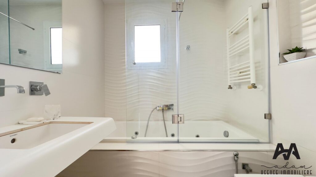 L’appartement se compose d’un salon avec un balcon offrant une vue sur la mer, une kitchenette équipée et aménagée avec plaque de cuisson, hotte, four, et un réfrigérateur encastré. La chambre à coucher dispose également d’un balcon, d’un dressing, et d’une salle d’eau avec baignoire