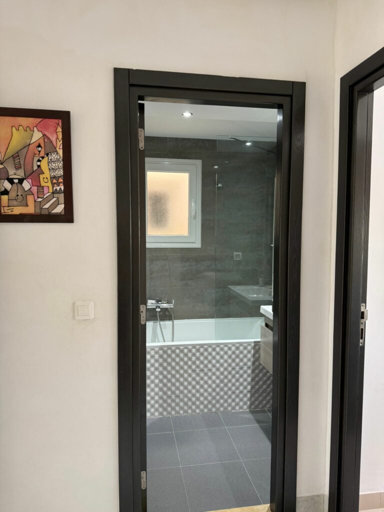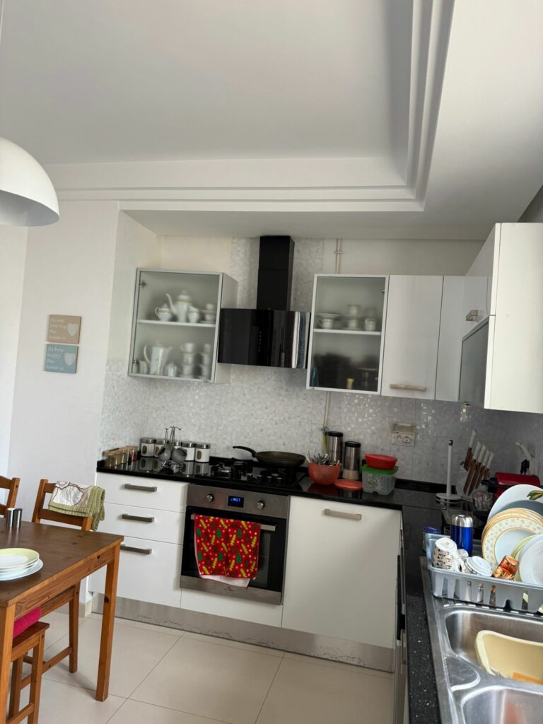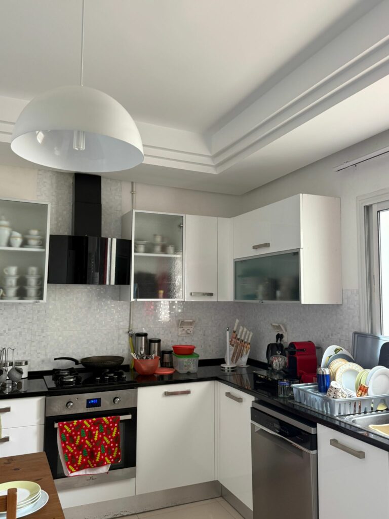 L’appartement dispose d’une cuisine indépendante moderne et entièrement équipée (plaque de cuisson, four, lave-vaisselle, machine à laver), ouvrant sur un balcon avec séchoir, aménagé avec un élément en aluminium. Il comprend également deux belles chambres avec dressings intégrés, calmes et baignées de lumière naturelle, ainsi qu’une salle de bain entièrement équipée.