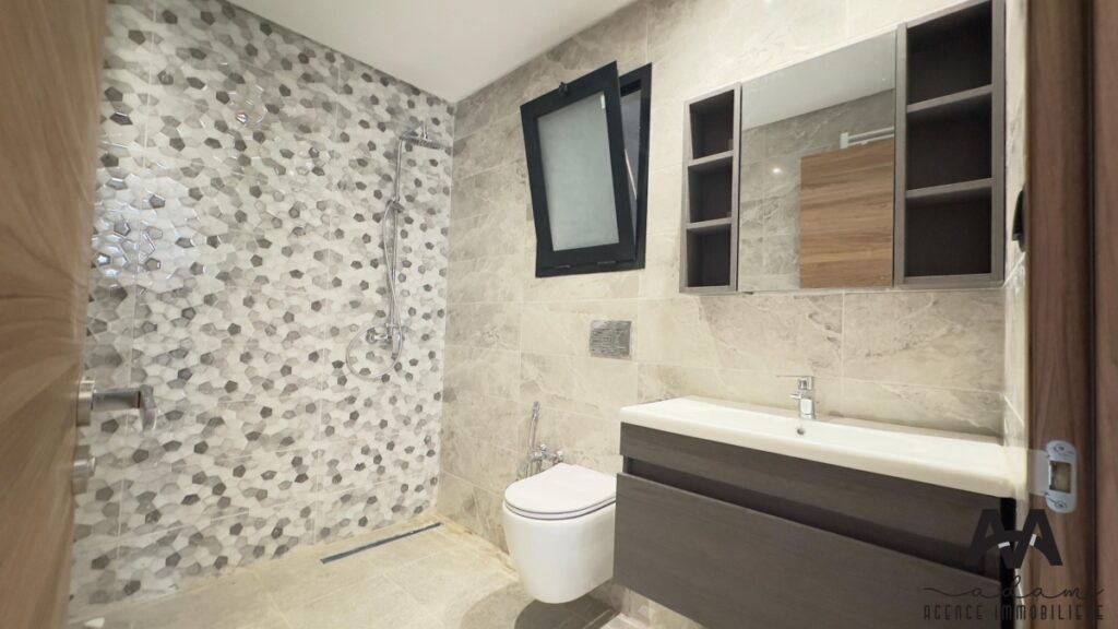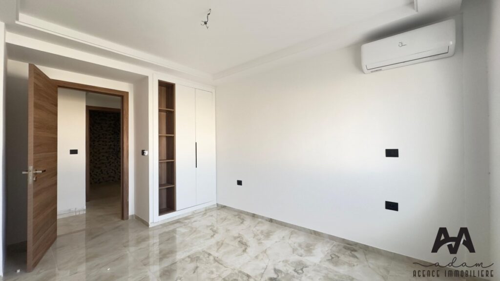 Emplacement : Mrezga, AFH2 – dans une résidence gardée et sécurisée avec piscine collective et double ascenseur, à seulement 10 minutes à pied de la plage et à proximité de toutes les commodités (magasins, restaurants, facultés, banques…).
