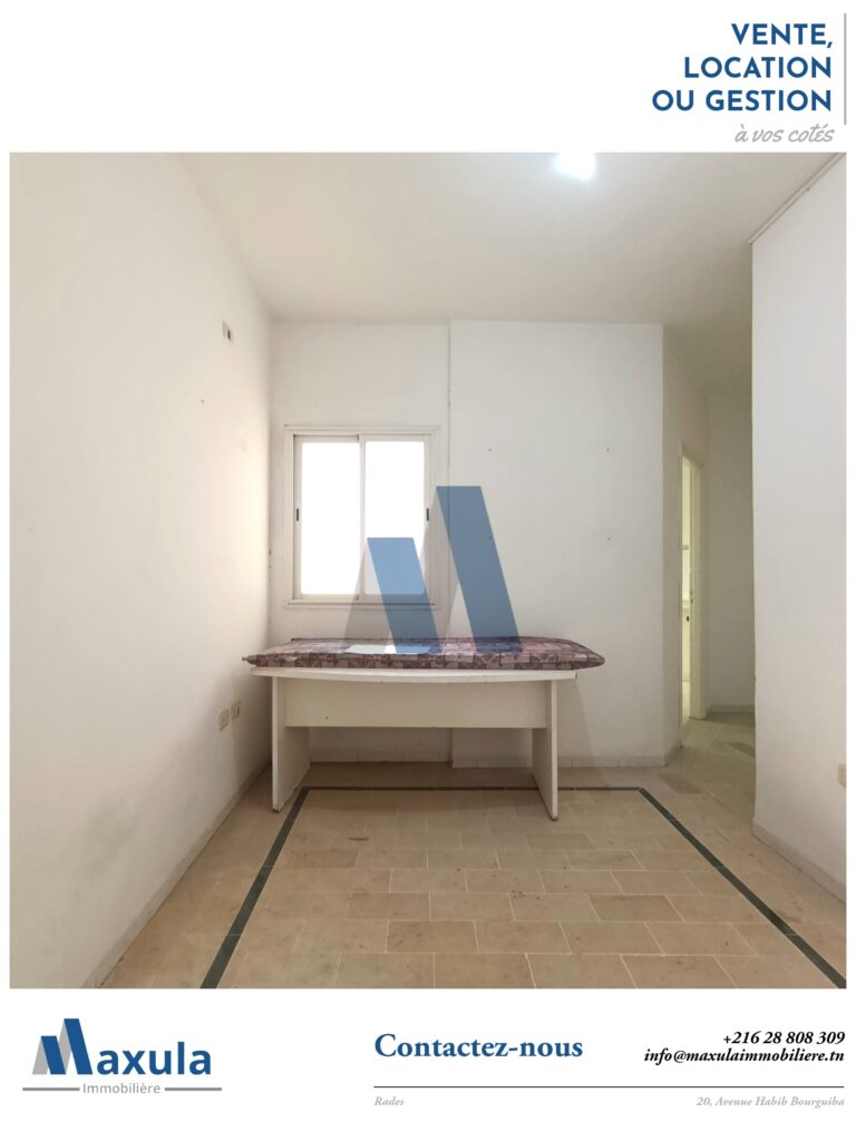 Si vous êtes à la recherche d'un espace de travail fonctionnel et bien situé pour développer votre activité professionnelle, ce bureau A+2 au 2ème étage à Radès est fait pour vous. N'hésitez pas à découvrir les possibilités qu'il offre pour votre entreprise ou votre projet.