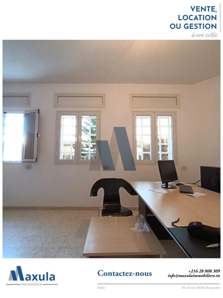 MAXULA IMMOBILIÈRE vous propose à la VENTE un IMMEUBLE BUREAUTIQUE EN R+2, édifié sur un TERRAIN avec TITRE FONCIER INDIVIDUEL de 418m², bénéficiant d’une façade de 14 mètres sur une voirie d’environ 10 mètres, idéalement situé en PLEIN COEUR DE RADES, entre les AVENUES HABIB BOURGUIBA et KHEIREDDINE, à proximité immédiate de toutes les commodités telles que gare de train, municipalité, commerces.