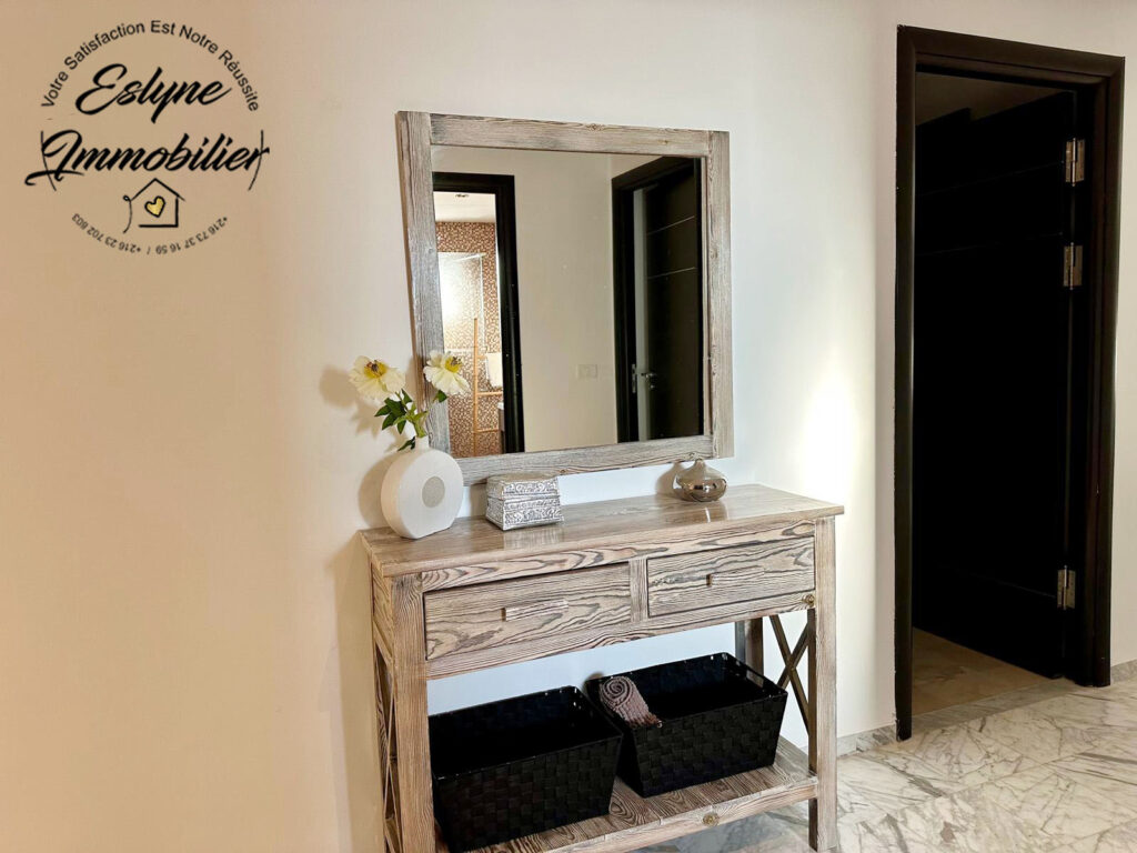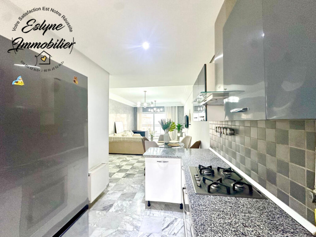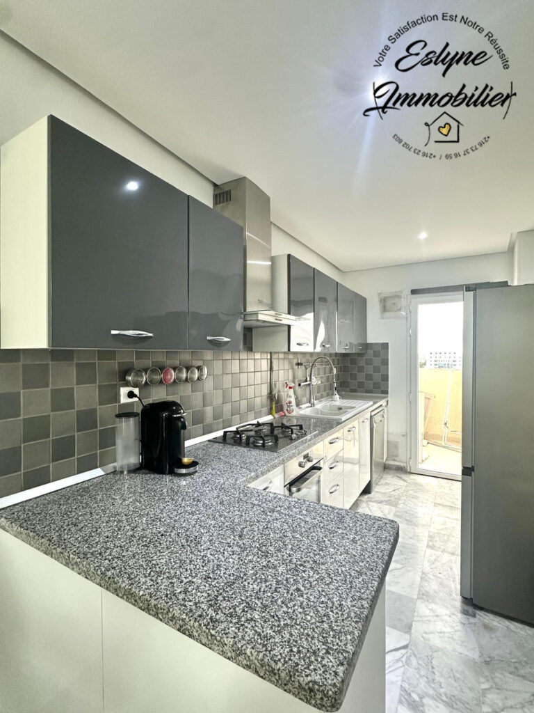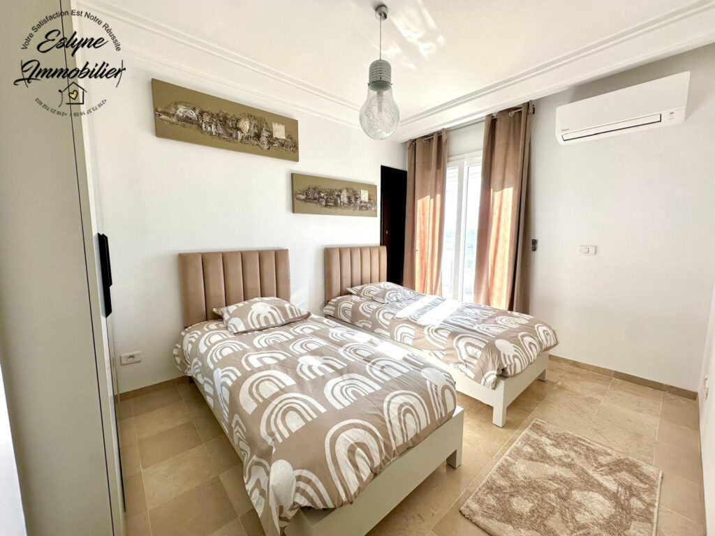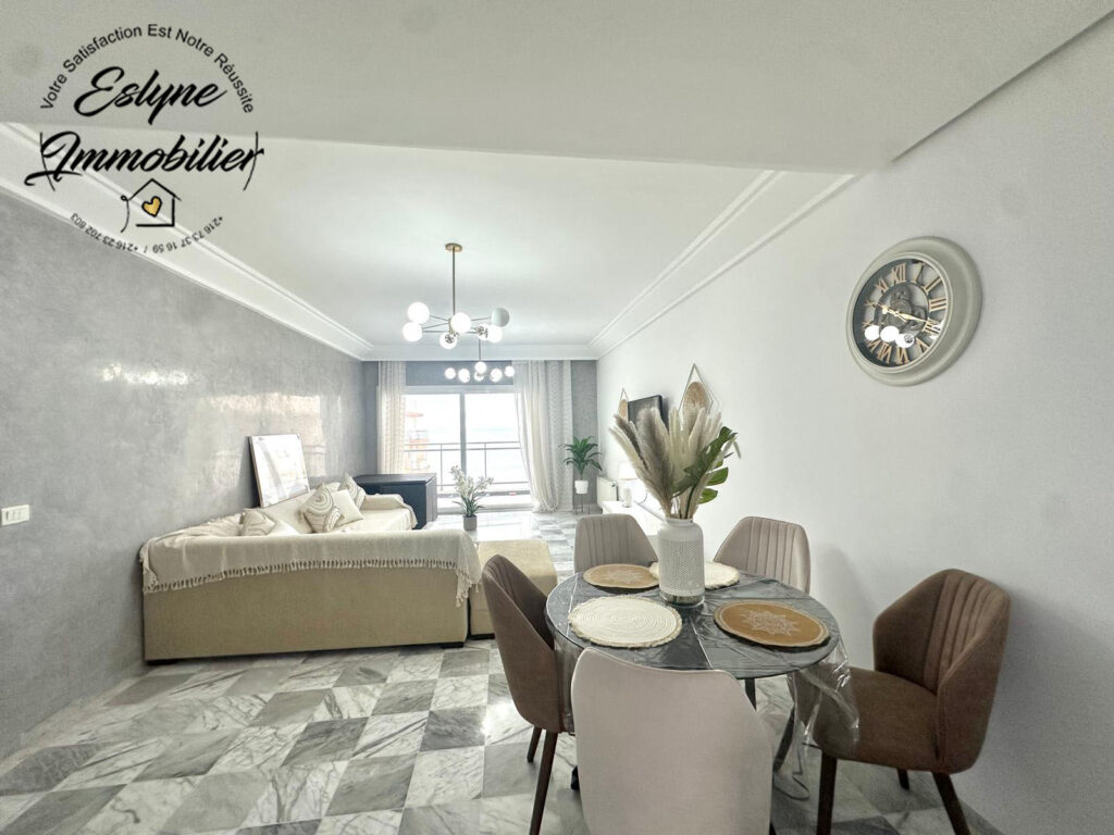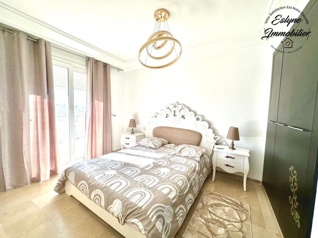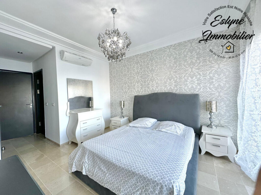 Eslyne Immobilier vous propose un magnifique appartement S+3 situé au 7ᵉ étage d’une résidence sécurisée avec piscine, sur la route de la plage, proche de toutes commodités