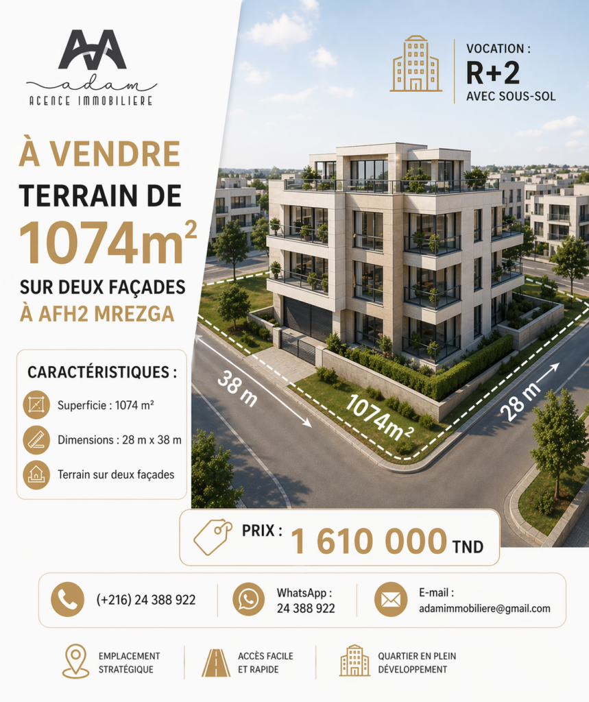 Recherchez un terrain idéal pour votre projet résidentiel ou de promotion immobilière ? L'agence ADAM Immobilière vous propose un terrain exceptionnel de 1074 m², bénéficiant de deux façades, situé à AFH2 Mrezga, dans la ville de Nabeul.