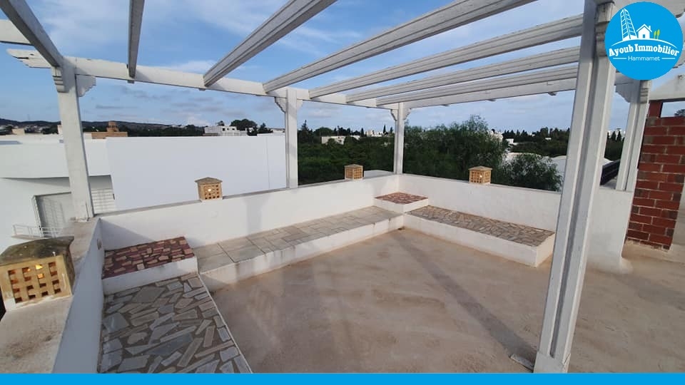Villa à louer à l’année à Hammamet, à 3km de Hôtel Sindbed. Elle se compose d’un grand salon avec cheminée donnant sur belle terrasse, une chambre avec dressing, une salle de douche et une cuisine avec un coin repas donnant sur le jardin avec barbecue. Quant à l’étage on trouve un autre salon, une salle de bain, une chambre et une suite avec terrasse. Au 2ème étage on trouve une buanderie et une très grande terrasse. La villa est totalement chauffée et elle comprend un abri pour 2 voitures. PRIX 2.300DT par mois.