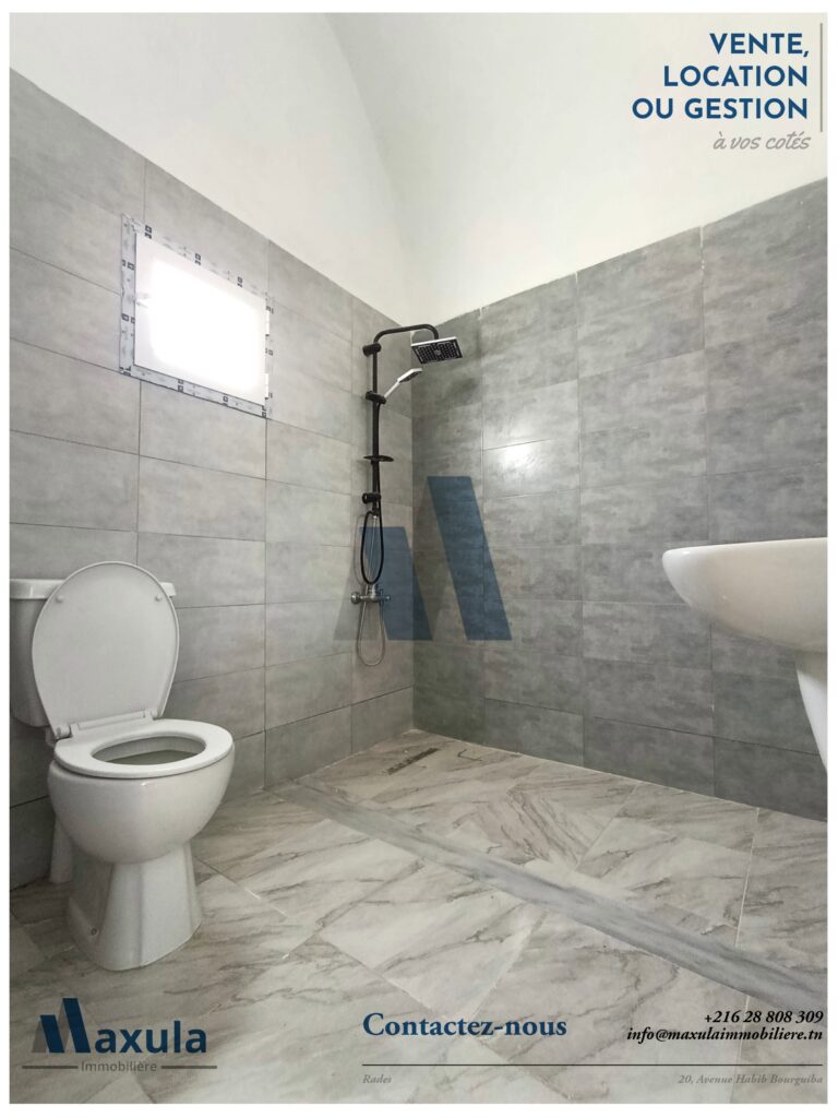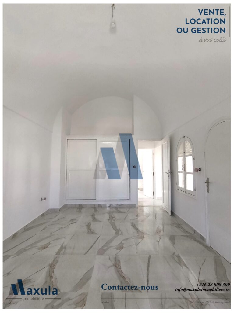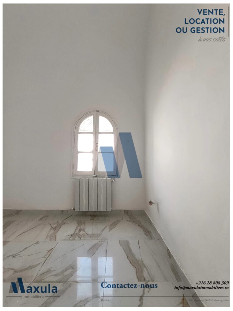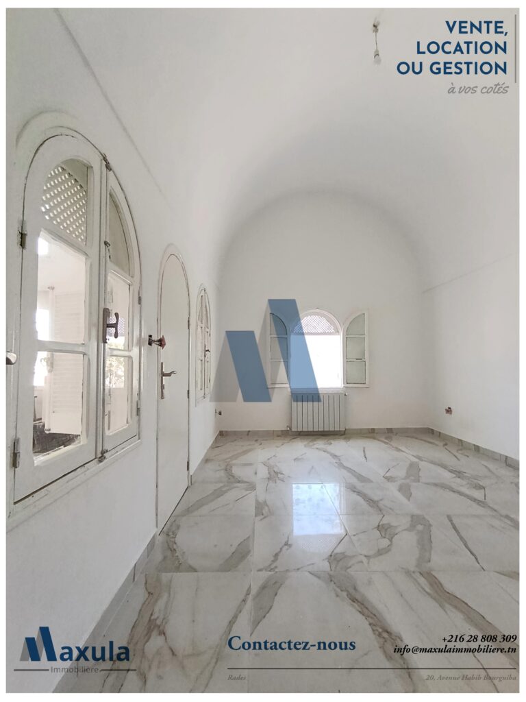 Située dans la ville de Radès, cette villa S+4 de style arabesque rénovée dans un esprit moderne est proposée à la location pour un loyer mensuel de 2000 TND. Avec une superficie habitable d'environ 90 m² implantée sur un terrain d'environ 500 m², cette propriété offre un emplacement stratégique et une excellente visibilité face à la mer de Radès Plage.